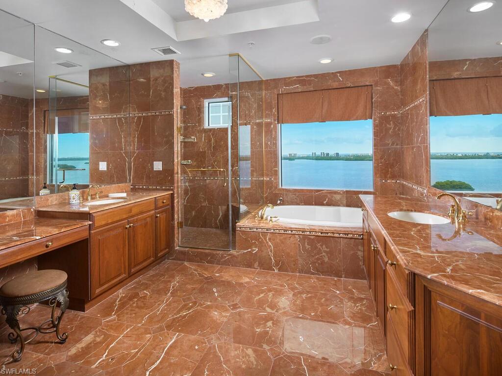 Come experience the VIEW of a lifetime from the desirable ninth floor in Azure of Bonita Bay! Take advantage of this rare opportunity to own one of the most desirable floor plans in Azure, at exactly the right height. Be high enough to enjoy the spectacular sunsets over the gulf yet close enough to the bay to enjoy the dolphin as they playfully jump and swim. With expansive views of the Estero Bay and the Gulf of Mexico beyond, this home is nothing short of spectacular! Space is more than ample, with over 4,500 square feet of living area under air! Unique features include a custom bar in the heart of the home, exquisitely crafted wood/glass doors at the entrance, an open and comfortable family room, a dedicated den/office overlooking the sea, two secured elevators wuth a private entry foyer, multiple outdoor areas offering Western views of The Gulf of Mexico as well as Eastern views of Southwest Florida, additional storage unit, tons of space for guests, screened outdoor kitchen/lanai space with a gas grill, hurricane shutters, coffered ceilings and so much more. All bedrooms are en suite. Enjoy sunrise as you relax with morning coffee on the Eastern facing terrace and breathtaking happy hour sunsets from bar and family room on the Western side of the home. Life at Azure is luxurious in every way w with executive style amenities such as a resort style pool and spa, a fitness center, club room, rooftop terrace, and only three residences per floor. There are also two guest suites available for overflow guests! Bonita Bay amenities include a private beach club, kayaks, canoes, pickle ball, tennis, several community parks/public spaces, 12+ miles of walking/biking paths and a full service marina/restaurant! There are FIVE golf courses, several restaurants, a state of the art fitness center, tennis and so much more available with club membership (additional fees)! Bonita Bay is close to ALL that SWFL has to offer - world class dining/shopping, beaches, nature preserves, the burgeoning downtown Bonita Springs, downtown Naples and so much more! A very SHORT ten minute drive to RSW International Airport! Whether you are searching for your winter retreat or a permanent residence, this home could very well be THE ONE!